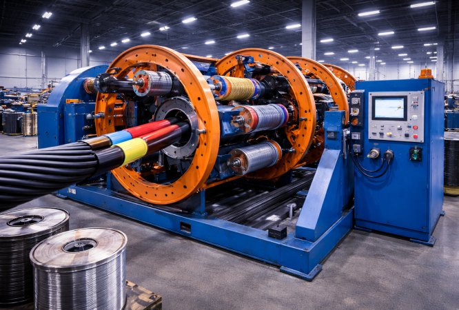 The Lay-Up Machine at Rana Afghan assembles multiple insulated conductors into a single multi-core cable structure, used for power, control, and instrumentation cables.